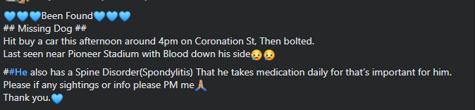 Jack Dog Center happily donated via Givealittle towards the recovery of this gorgeous boy. Have seen the last night “lost” post of him, being injured then lost in a horrific weather and planned to go look for him – it was heartbreaking.