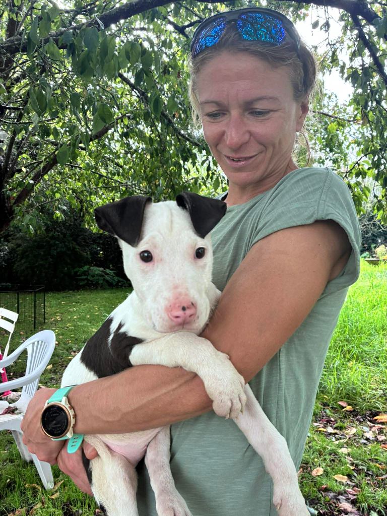 Little bub Orion found his amazing family today and was very content in his human mom’s arms! This little pup, with his adorable spotted little nose, is truly lucky to have two wonderful people to call his own, along with a playful little human brother to join in on the fun.